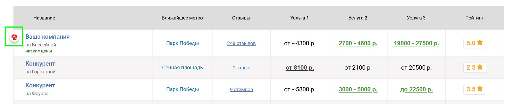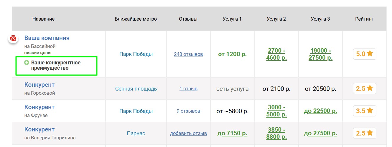 Иконка 16х16 пикселей будет отображаться слева от названия вашего центра в таблицах, выделяя его среди прочих. Опция увеличивает вероятность перехода на страницу компании и рекомендуется в качестве дополнения к прочим методам продвижения, в первую очередь для центров с узнаваемым брендом.