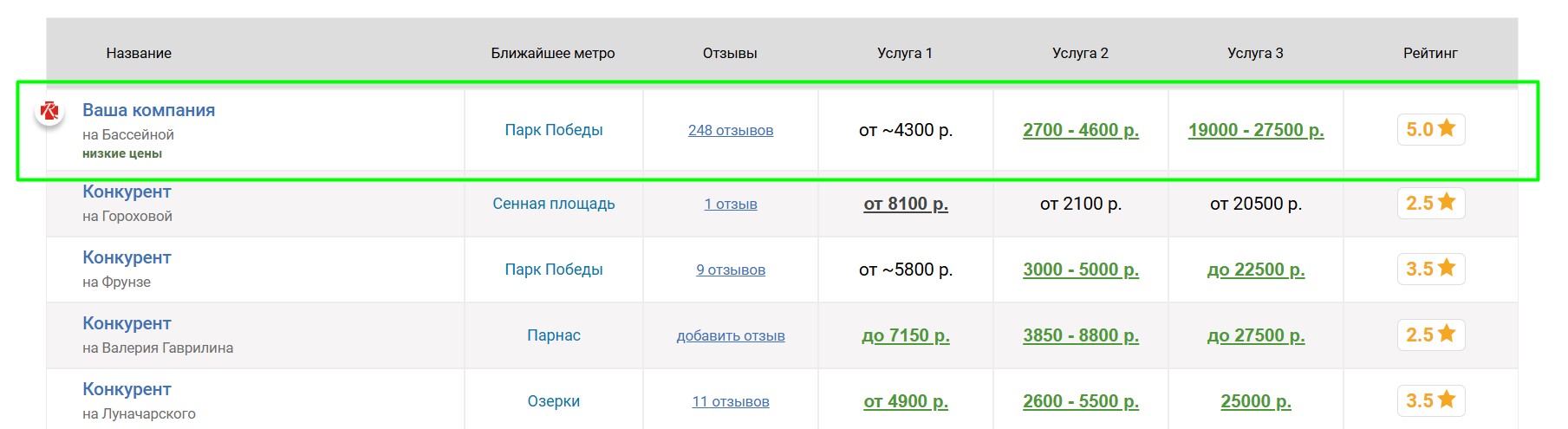 Вокруг продвигаемого таким образом центра выбирается некоторое количество ближайших конкурирующих центров, продвигаемый центр попадёт к ним в таблицу «Сравнение по ценам», которая выглядит следующим образом: